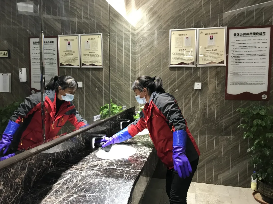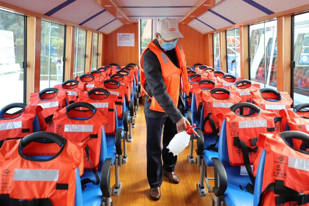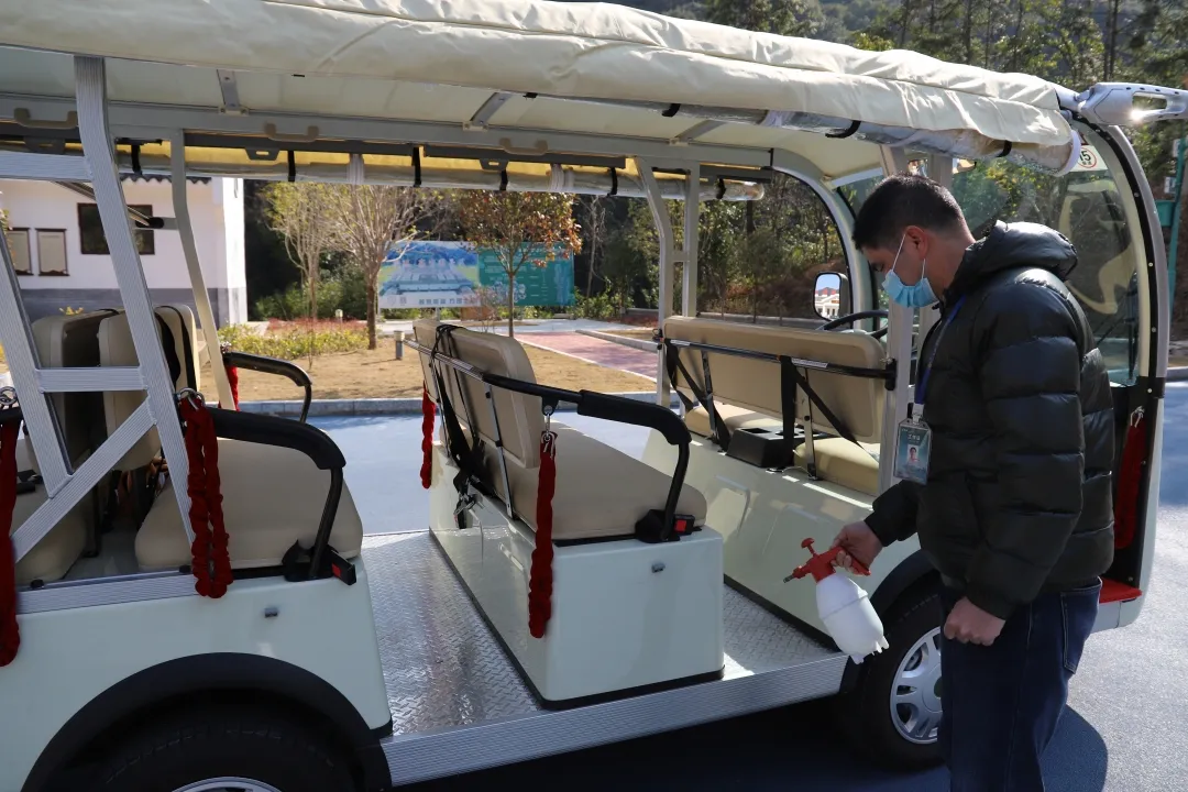 景区的工作人员每日会对景区的游船、车辆、室外区域及办公室进行全方位无死角的消毒工作,特别是针对公共区域的地面、墙面、卫生间、垃圾桶等重点消毒。