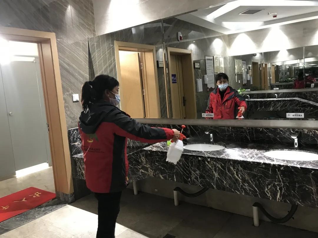 (清洁员在对公共卫生间的洗手台面进行擦拭和消毒)