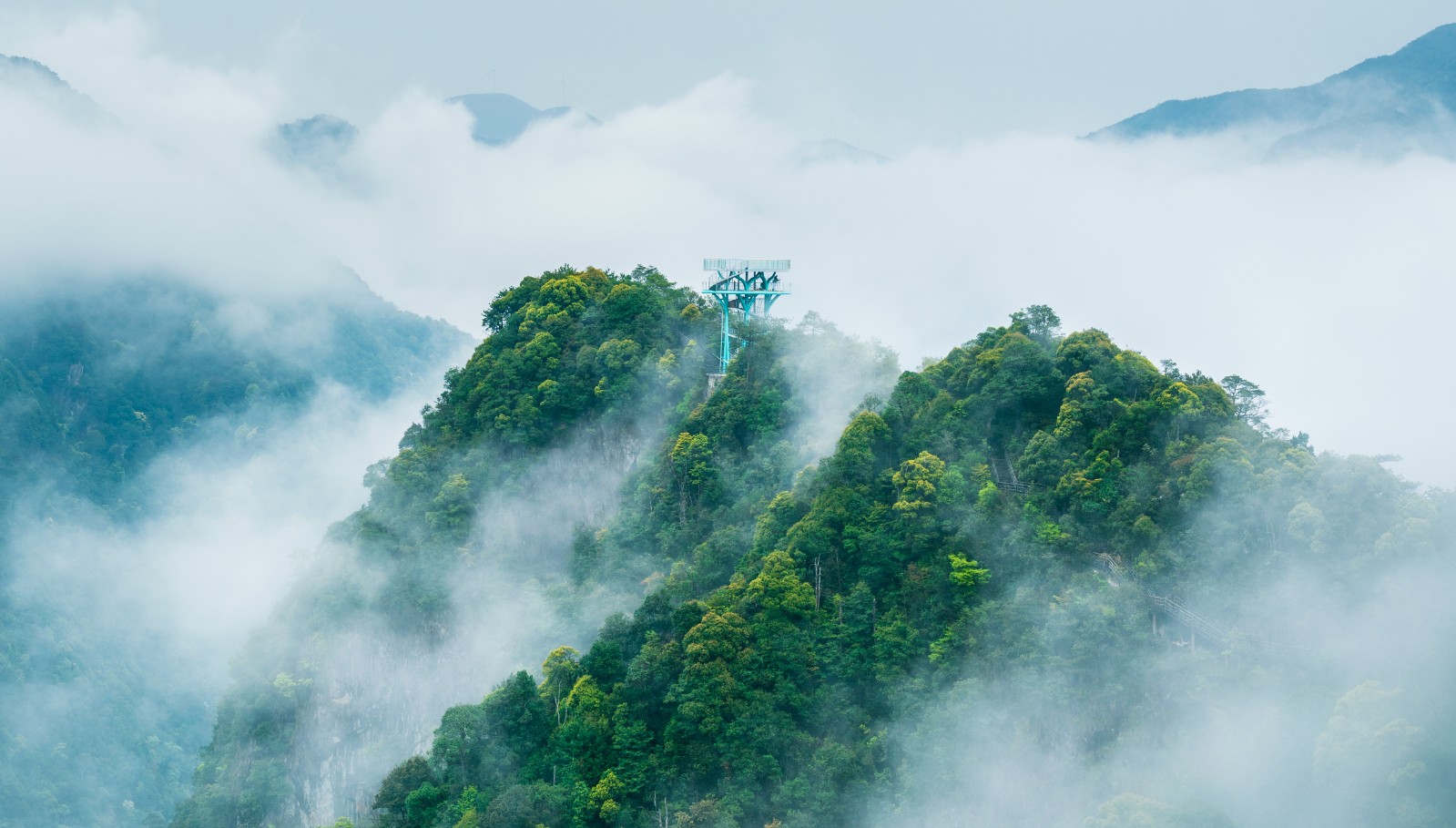 天空之镜观景平台位于三百山景区剑尖峰山顶,海拔高度1064米,观景平台采用钢结构塔式结构,塔高14米,外形犹如香港特别行政区的区花紫荆花。塔楼共有2个观景平台,11米标高的是钢结构平台,面积约96㎡;14米标高的是钢化玻璃平台,面积约113㎡,玻璃平台上刻有一朵绽放的紫荆花,寓意香港同胞与安远人民的深厚情谊。登上天空之镜,远眺三百群峰、原始林海,广阔天地间的美景令人心旷神怡。
