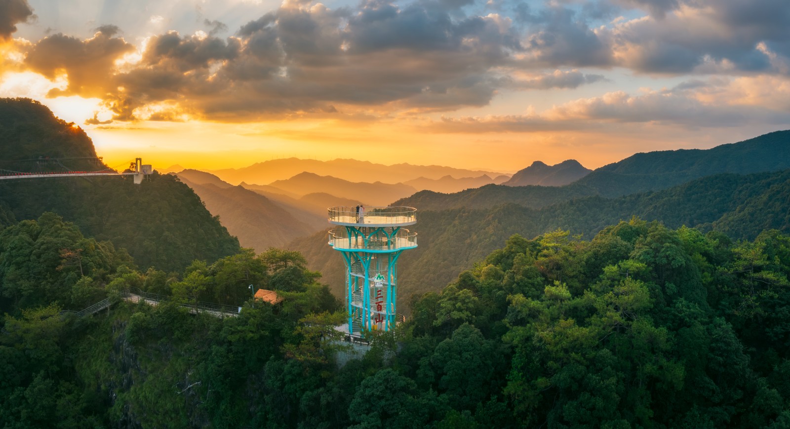 天空之镜观景平台位于三百山景区剑尖峰山顶,海拔高度1064米,观景平台采用钢结构塔式结构,塔高14米,外形犹如香港特别行政区的区花紫荆花。塔楼共有2个观景平台,11米标高的是钢结构平台,面积约96㎡;14米标高的是钢化玻璃平台,面积约113㎡,玻璃平台上刻有一朵绽放的紫荆花,寓意香港同胞与安远人民的深厚情谊。登上天空之镜,远眺三百群峰、原始林海,广阔天地间的美景令人心旷神怡。